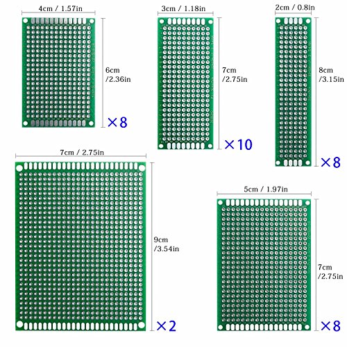 Package: Include double sided PCB prototype boards in 5 different sizes, 2x8cm* 8 / 3x7cm* 10 / 4x6cm* 8 / 5x7cm* 8 / 7x9cm* 2 / Free plastic box * 1, Total 36 pieces