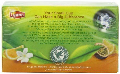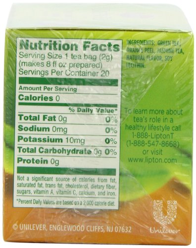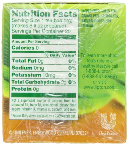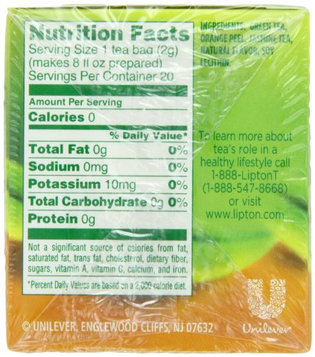 - Binding : Grocery- Brand : Lipton- Label : Lipton- Manufacturer : Lipton- ProductGroup : Grocery- ProductTypeName : GROCERY- Publisher : Lipton- Studio : Lipton- Title : Lipton Green Tea, Orange Passionfruit and Jasmine, 20 Count Box