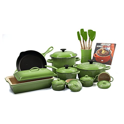 -. Feature : Le Creuset 24 Piece Gourmet Cookware Set - includes enameled cast iron, enamel on steel, stoneware, and silicone products / Includes enameled cast iron covered 4.5 quart round French oven, enameled cast iron covered 1.75 quart saucepan, enameled cast iron 10.25 iron handle skillet, enamel on steel covered 8 quart stockpot, stoneware covered 4 quart rectangular casserole dish, stoneware covered 4 - 8 ounce cocottes with recipe book, stoneware utensil crock with silicone tools (small spatula, medium spatula, spatula spoon, basting brush, and jar scraper) / Enameled cast iron exterior resists chipping and cracking / Skillet requires no seasoning / Dishwasher safe - enameled cast iron, stoneware, and silicone blades; hand wash - enamel on steel and wood handles