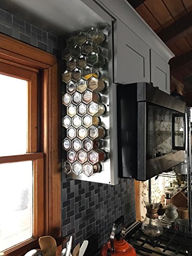 - Add a steel wall base and display containers on backsplash, pantry door, or mount under a shelf. Hanging spice racks keep spices in sight, improving your cooking by encouraging you to experiment more. Perfect graduation or housewarming gift idea for the new cook. No more spices going stale in your cabinets.