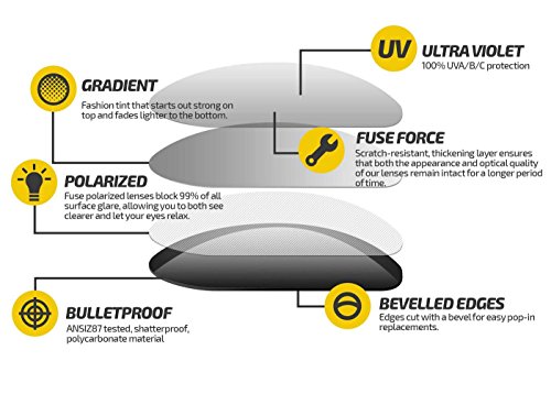 Fuse Gradient Grey Polarized Lenses. Dark Grey at the top and fade lighter towards the bottom. A popular choice for high-end or fashion frames. Neutral grey view. Grey tint offers true color perception. Cuts through blinding glare. Enhanced depth perception. Fuse Force extra dense scratch resistant hardcoating