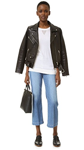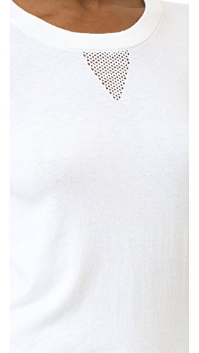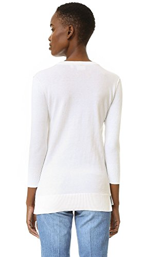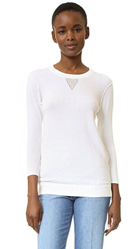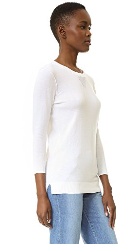 Pointelle detailing below the banded neckline offers a nod to sporty style on this delicate knit AG sweater. Side vents relax the uneven hem. 3/4 sleeves.