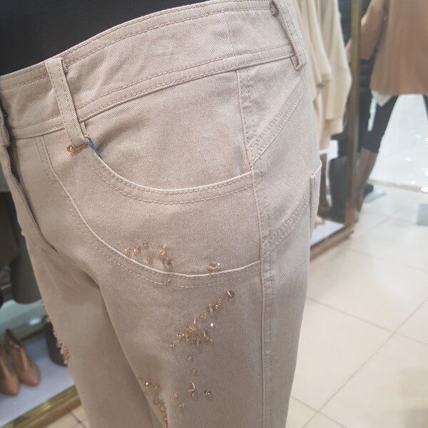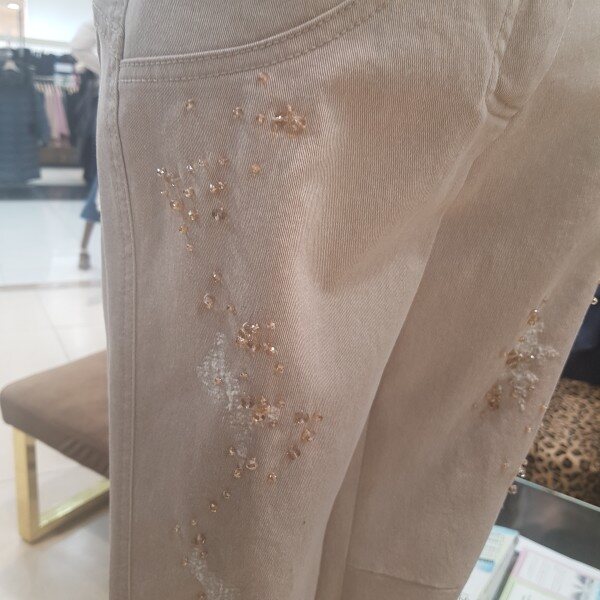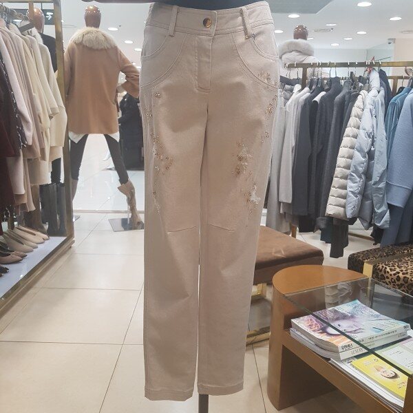 비즈로 워싱부분에 포인트를 준 스키니팬츠 디자인입니다.