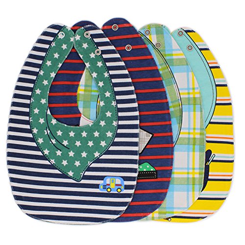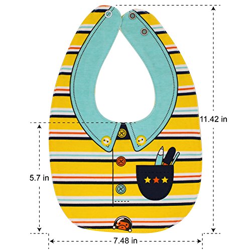 REVERSIBLE & WATERPROOF - 8 different styles with a 4 layered design of our baby bibs helps in moisture management. The front and back layer is made up of 100% cotton which has high absorption to restrict any fluid from crossing the bib's boundaries. The internal layer comes with a polyester fleece which resists moisture and prevents it from passing through to your baby's clothes.