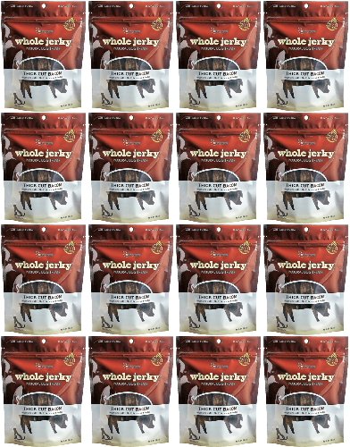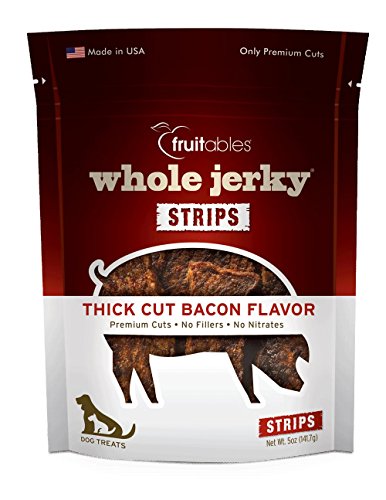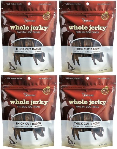 Made of the highest quality USA-raised pork, Fruitables Whole Jerky Dog Treats Thick Cut Bacon 20oz (4 x 5oz) are thick meaty cuts that will satisfy even the wildest cravings. There's a truly amazing sensory experience in each fresh pack. These limited-ingredient treats are made so fresh you can smell the difference. No added fillers, nitrates, sugars, or salt.Feature