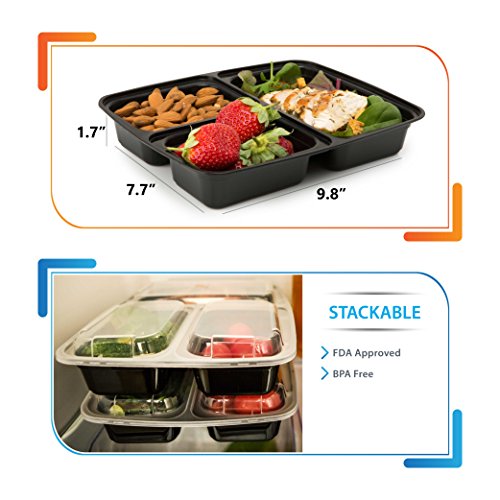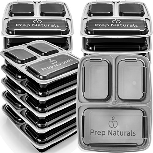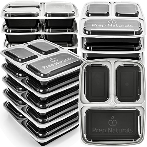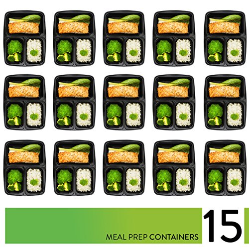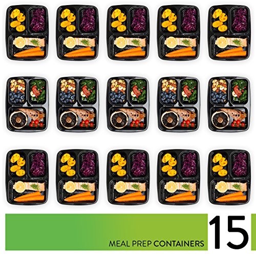 A 15-pack set includes: - 15 Meal prep boxes with 3 compartments each - 15 clear, tight but easy to open lids