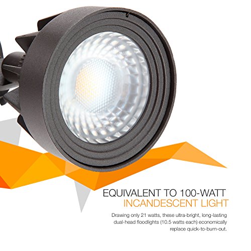 EQUIVALENT TO 100-WATT INCANDESCENT LIGHT: Drawing only 21 watts, these ultra-bright, long-lasting dual-head floodlights (10.5 watts each) economically replace quick-to-burn-out, electricity-guzzling incandescent bulbs without skimping on vivid security-level brightness. Rotating outer bezels made of steel.