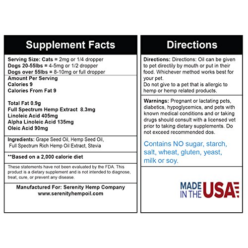-. Feature : HELP REDUCE YOUR PETS PAIN! Our perfect blend of Omega-3 fatty acids will also assist in reducing pain. The ingestion of these fatty acids can promote the body to produce anti-inflammatory properties. Ailments that may help your pet in pain include: arthritis, chronic pain, inflammation, joint & mobility issues, and much more. / REDUCE THE RISKS OF CANCER AND OTHER DISEASE! Studies show that pets with cancer and other illnesses do not make enough Gamma Linolenic Acid (GLA), an Omega-6 fatty acid. Serenity h.e.m.p for Pets gives you the perfect Omega-3 fat balance to give your pet the GLA's they need! / IMPROVE YOUR PETS SKIN AND COAT! The oil in our product can penetrate the inner layers of the skin and promote cell growth for your pets skin and hair. Again, the perfect balance of fatty acids plays an important role in reducing inflammation, redness, dryness, and damage caused with common skin issues. Give your pet relief from dry skin and a healthier looking coat. / POWERFUL h.e.m.p EXTRACT FOR YOUR PET! Serenity h.e.m.p contains absolutely NO THC and is non psychoactive at all! Our extract comes from an advanced CO2 extraction using organic h.e.m.p, optimizing the plants naturally occurring terpenes, constituents, essential fatty acids (Omega 3, 6, 9), and phytochemicals. / USA MADE! Serenity h.e.m.p for Pets is made in the USA by an FDA Inspected and GMP Certified Facility. Our product is non GMO and 100% Organic.