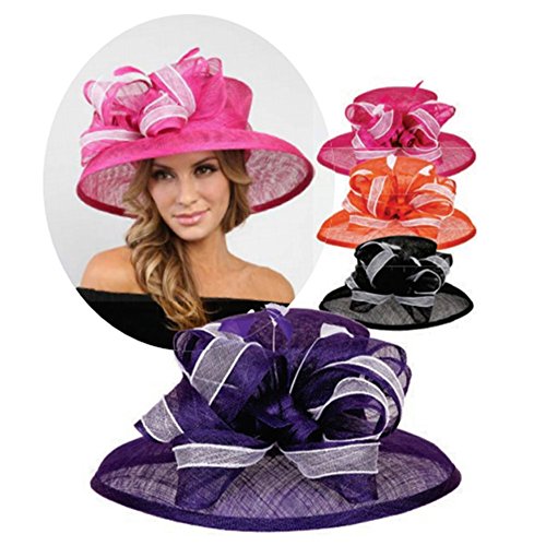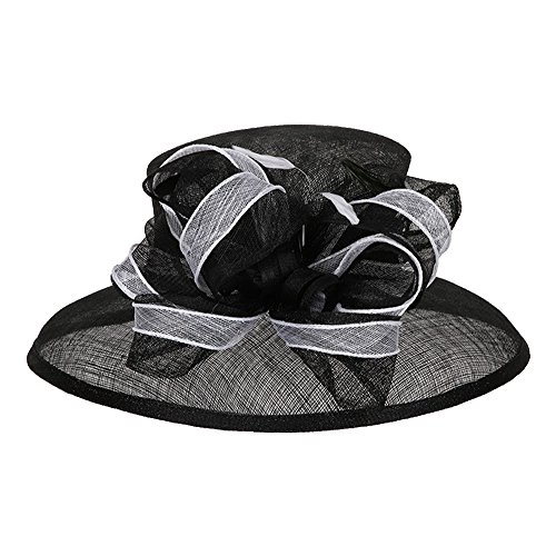 Product Description? Color : Black ? Crown Circumference : 23" ? Crown Height : 4" ? Brim Width : 4" ? Material : 100% Sinamay ? Loopy Cluster Feather Large Down Brim Sinamay Hat0