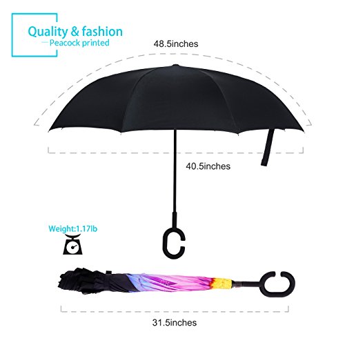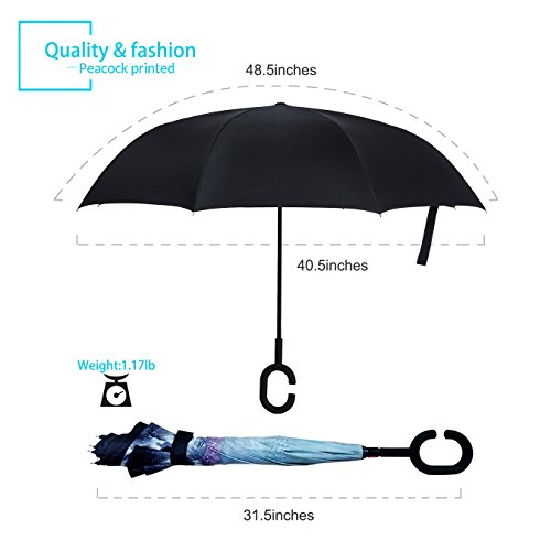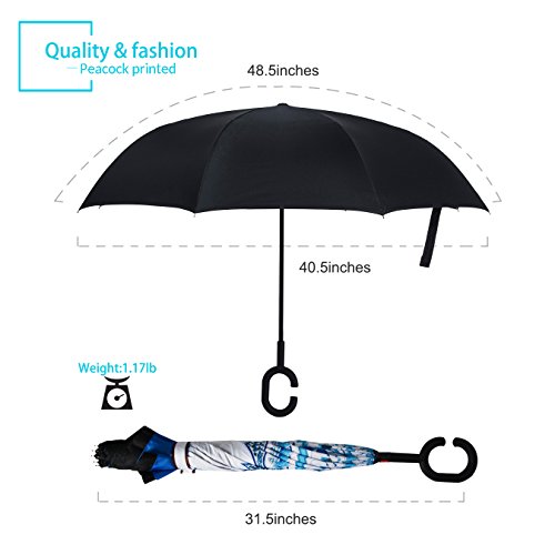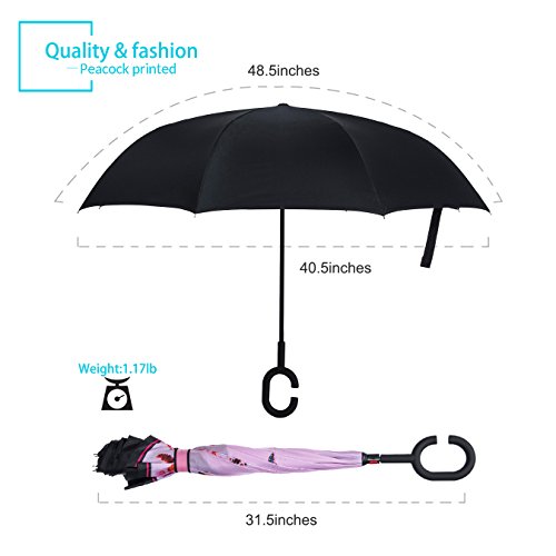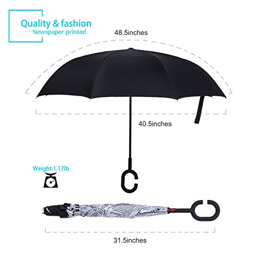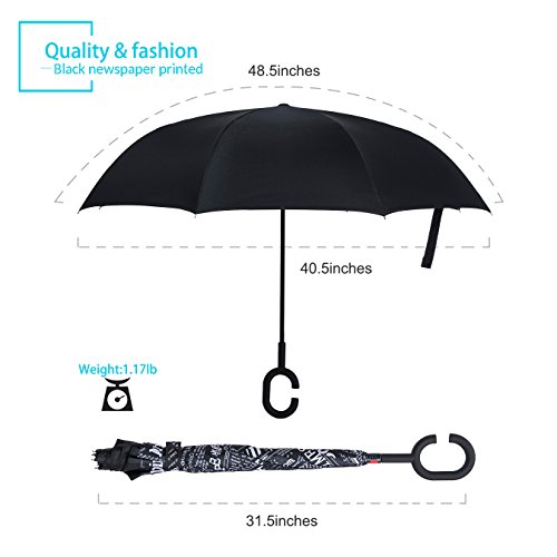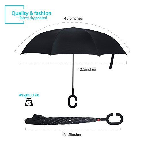 Specification: Model: New Conversion Inverted Umbrella for car Cloth Material: double layers high-density water repellent fabric Rib Material: carbon fiber high hardness skeleton Self Standing design: Can stand up on its own Umbrella Handle: Rubberized plastic matte painting handle with C shaped Be suitable for 1~2 person Weight: 1.1 LB Package Size: 31.5 x 2.99 x 2.99 inch
