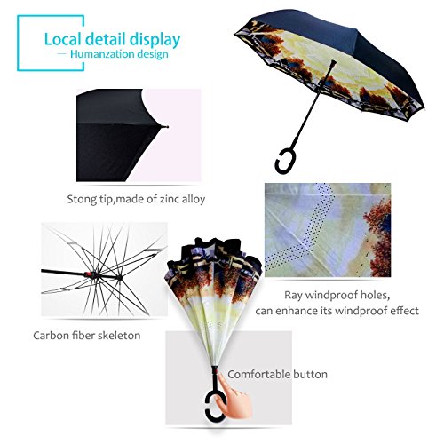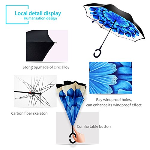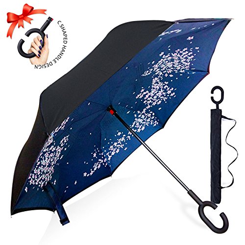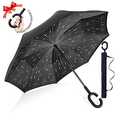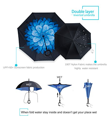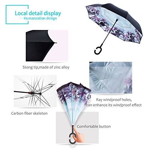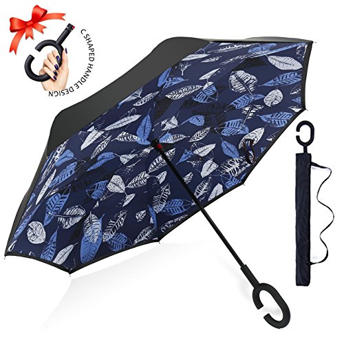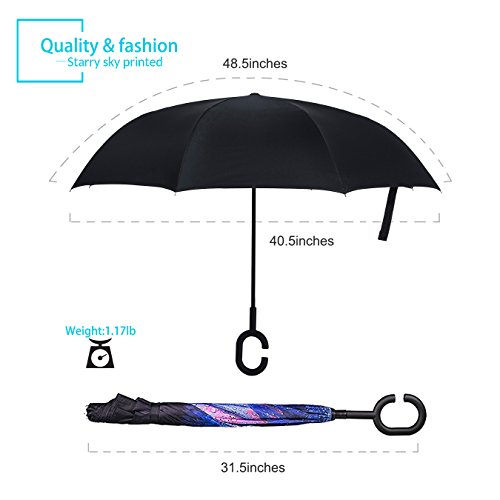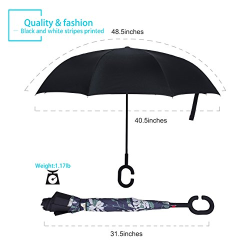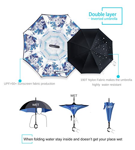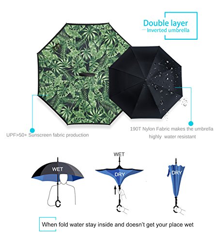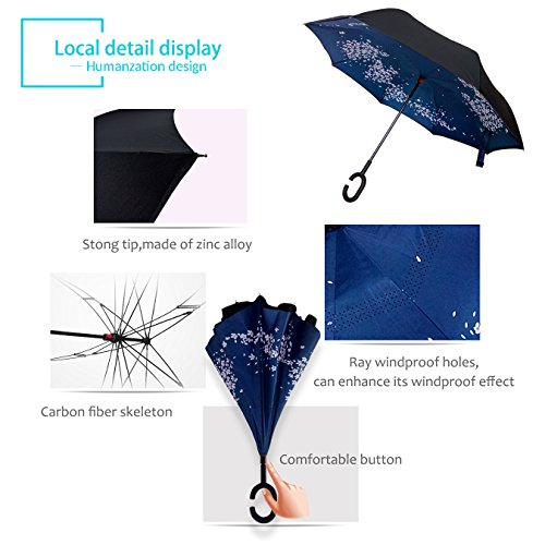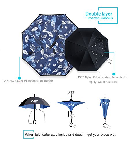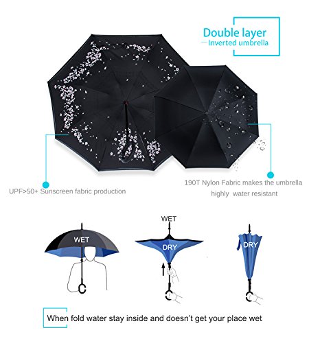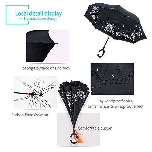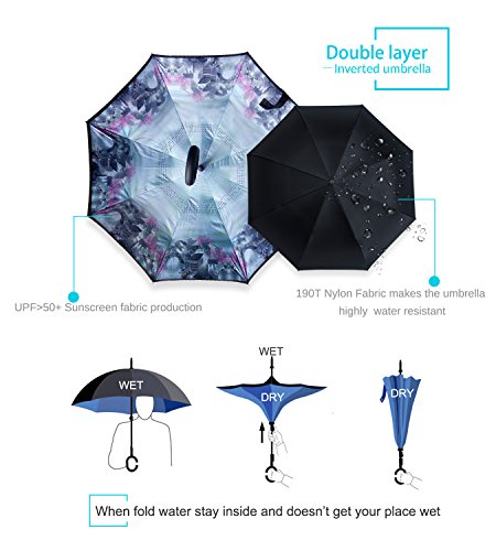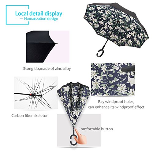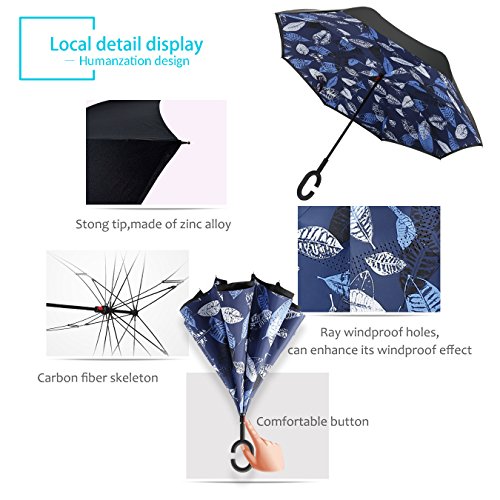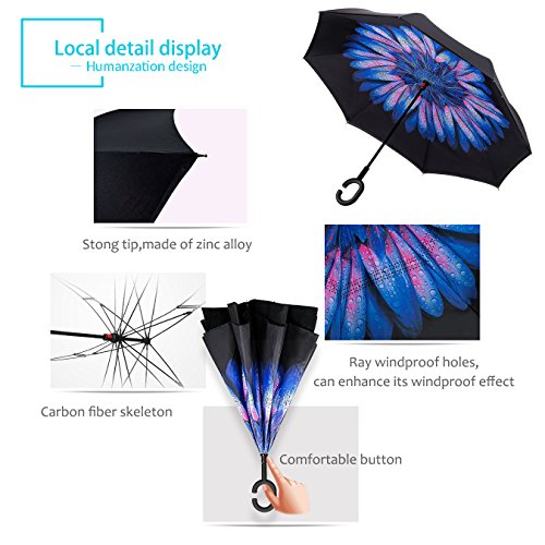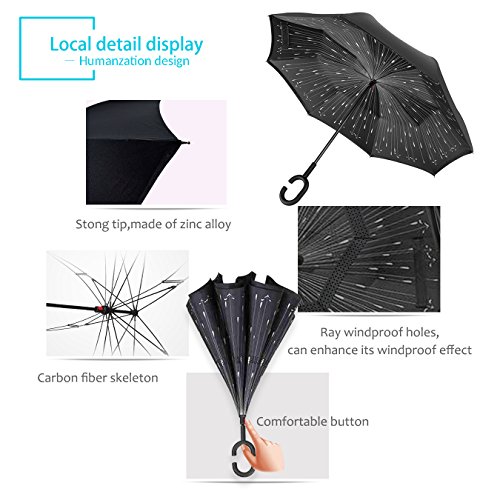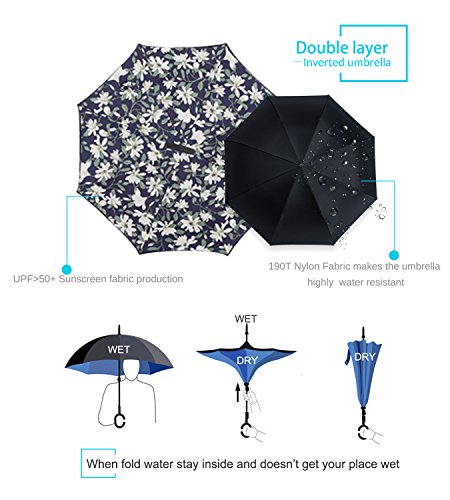 Studio : ZOMAKE Publisher : ZOMAKE Product Description 1.This novel inverted umbrella is a great gift for your friends,parents,lovers etc. 2.Windproof and waterproof,Uv protection,perfect for rainy day or sunny day. 3.Control:Non-automatic Open Length 42.5 inch Folded Length 31.5 inch. 4.Fashion C shape handle,cross the C-shape handle over your arm and made you hands free. 5.Unique design of double inverted umbrella,inside-out design prevents water from dripping, keeping floors and cars dry. 6. The double layer inverted umbrella made of:pongee cloth, durable black electric ribs and double layer ribs make the cars umbrella more sturdy, enhance its windproof effect. 7.The inverted umbrella can stand up on its own, ideal for when you have nowhere to prop your umbrella up against.It will also keep the wet part of the umbrella inside once you've closed it. 8.With a simple click of the embedded button, you can open and close the umbrella in confined spaces when entering or exiting a building or car and it's less awkward and more safer to open and close when in crowds, since the danger to poke in people's eyes has been removed by the design.