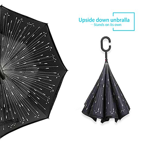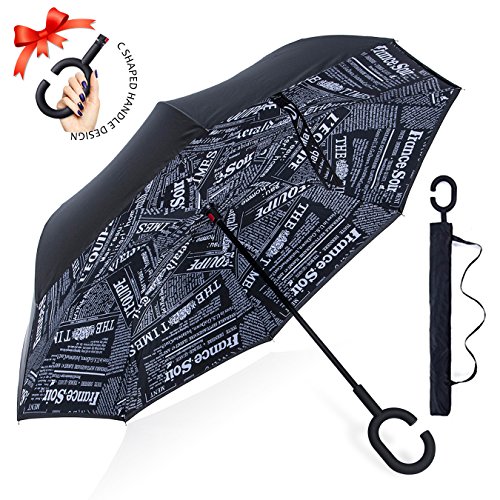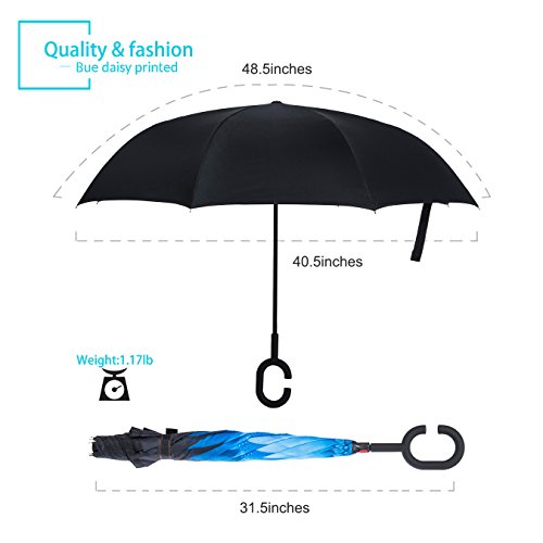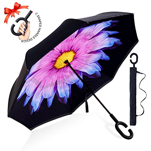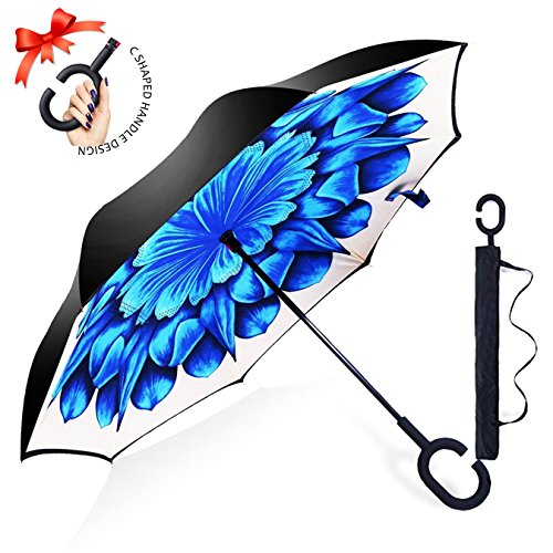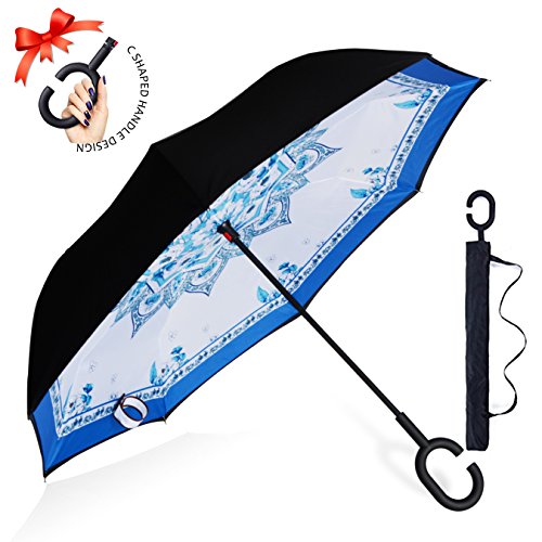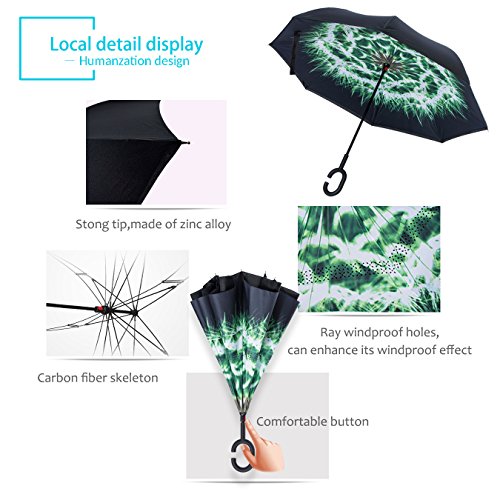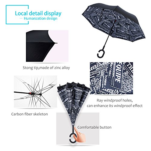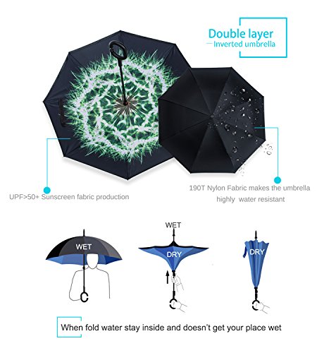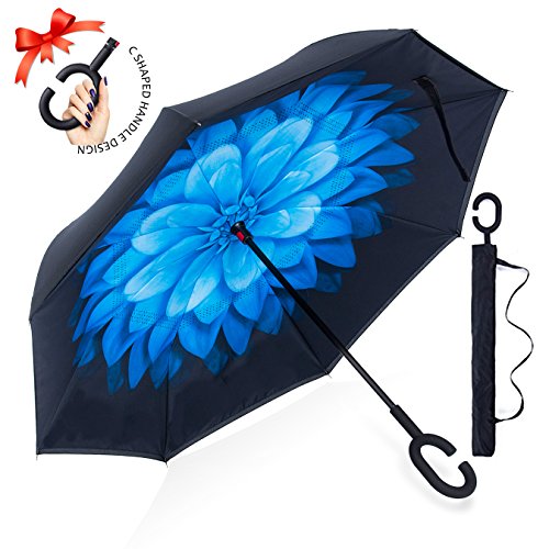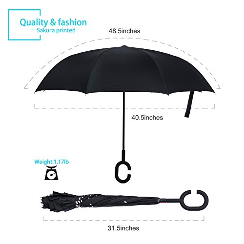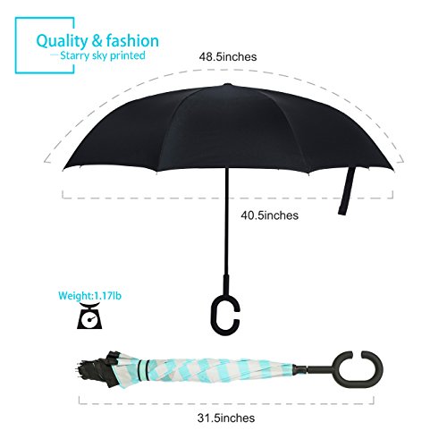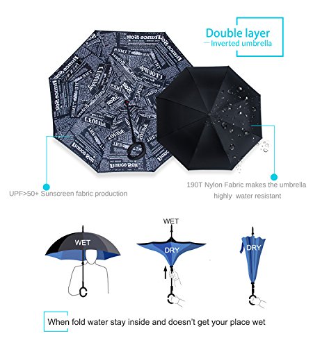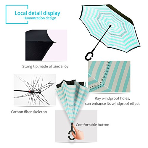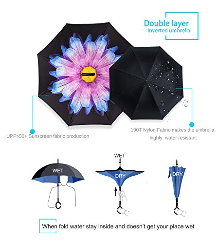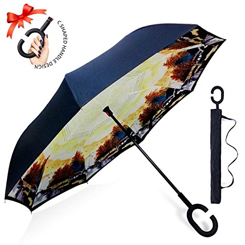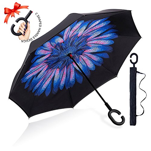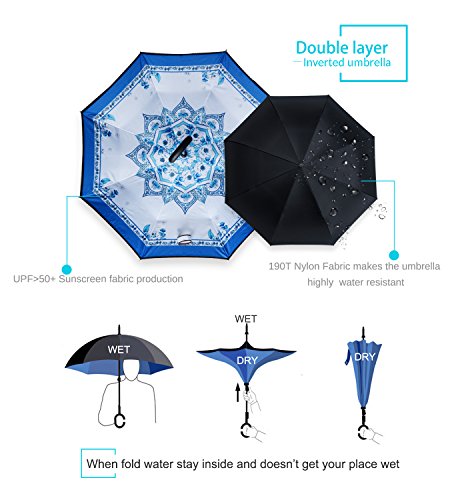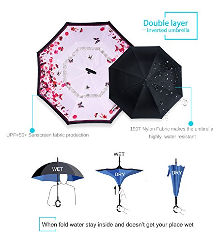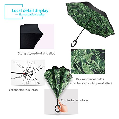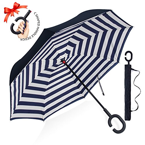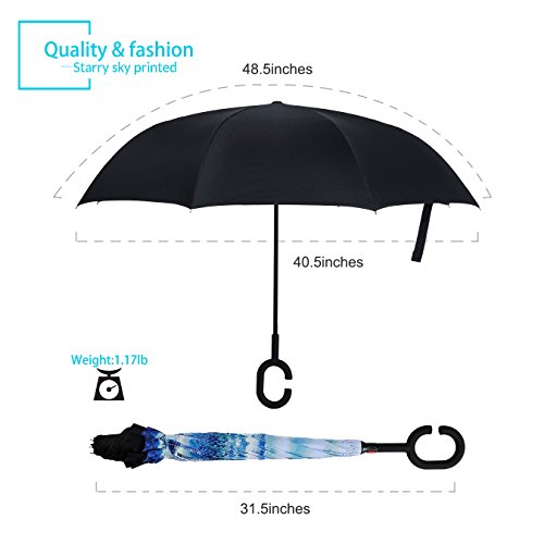 Studio : ZOMAKE Publisher : ZOMAKE Product Description 1.This novel inverted umbrella is a great gift for your friends,parents,lovers etc. 2.Windproof and waterproof,Uv protection,perfect for rainy day or sunny day. 3.Control:Non-automatic Open Length 42.5 inch Folded Length 31.5 inch. 4.Fashion C shape handle,cross the C-shape handle over your arm and made you hands free. 5.Unique design of double inverted umbrella,inside-out design prevents water from dripping, keeping floors and cars dry. 6. The double layer inverted umbrella made of:pongee cloth, durable black electric ribs and double layer ribs make the cars umbrella more sturdy, enhance its windproof effect. 7.The inverted umbrella can stand up on its own, ideal for when you have nowhere to prop your umbrella up against.It will also keep the wet part of the umbrella inside once you've closed it. 8.With a simple click of the embedded button, you can open and close the umbrella in confined spaces when entering or exiting a building or car and it's less awkward and more safer to open and close when in crowds, since the danger to poke in people's eyes has been removed by the design.
