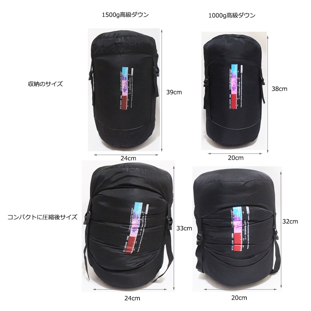Storage size (before compression): 38 * 20 cm / 1000 g down, 39 * 24 cm / 1500 g down