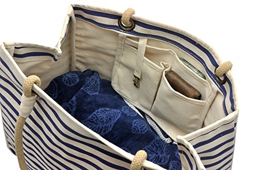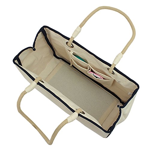 -. Brand : BeachMall -. Feature : Heavy duty 18 oz canvas material with storage compartments inside. This premium natural canvas has tighter weave construction making it more durable and sturdier compared to most canvas bags. This quality tote is designed to withstands tough use and to last for years! Must see to believe it. / Open Dimensions - exclusive of handles (inches): 18W x 13.5H x 8D Diameter ; Folded Dim. (inches): 22 x 13 x 1 ; Spot clean with mild detergent and air dry. / Weighs 1.7 lbs and lies flat for easy storage; Inner Pouch (7H x 9W inches) with 3 compartments to store wallet, cell phone, keys. / The carabiner hook (located inside) holds your keys or sunglasses. Hardboard base to prevent the middle base from sinking unlike most other canvas bags. The stylish handle is 14 inches high and comfortable to carry / This tote will not rip off! Piping stitching with hem around all edges for added strength & durability. Neatly-stitched seams give it a clean look. -. ProductGroup : Apparel -. ProductTypeName : LAGE -. Title : Deluxe 18oz Heavy Duty Canvas Rope Tote Bag with Compartments