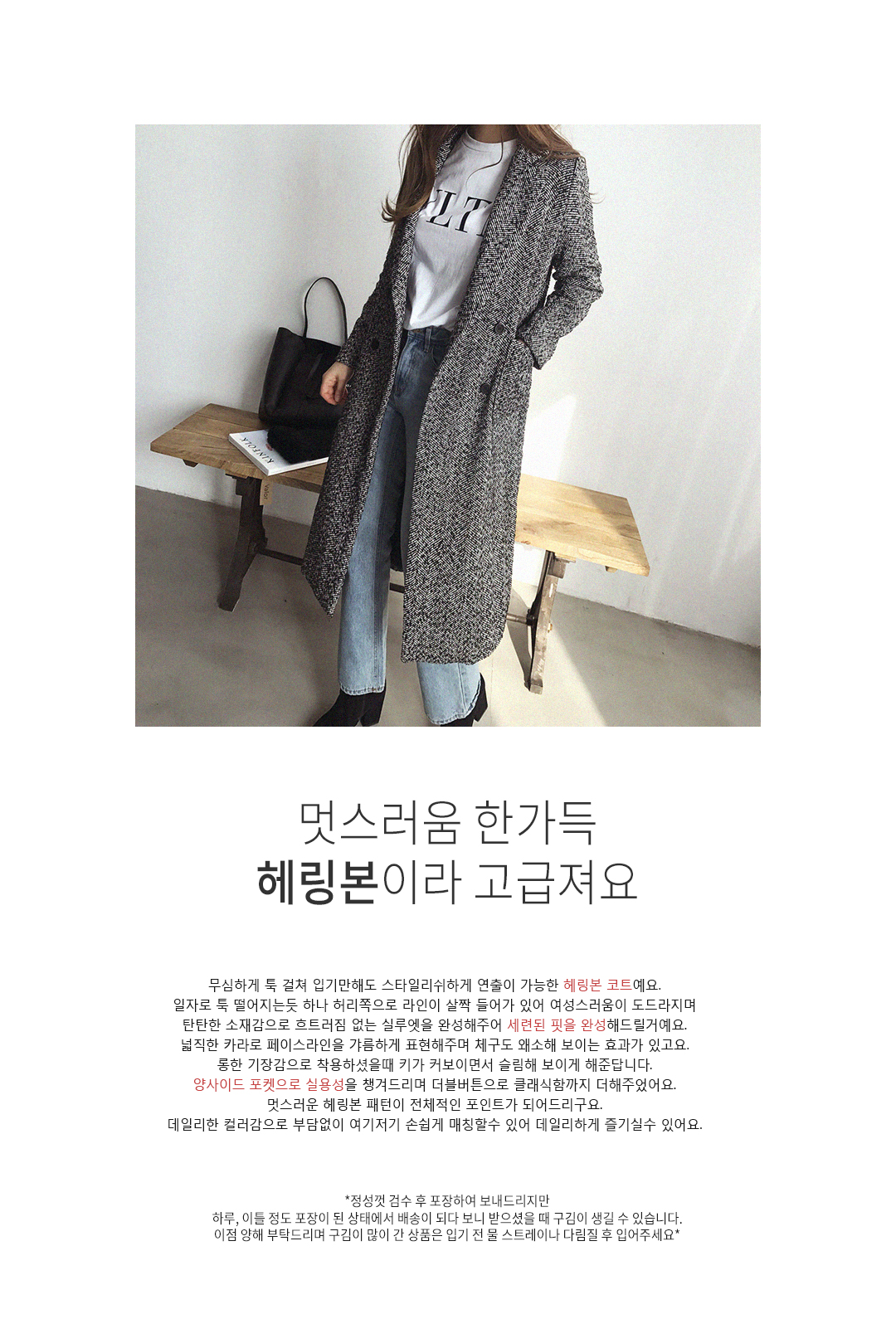 배송 받으실 때까지 예쁜 핏 그대로 받아 보실 수 있도록 카라 부분을 실로 고정하거나 주머니를 막아 놓은 부분이 있습니다.