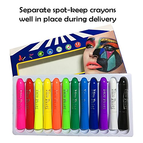 SPECIAL DEISGN - All of the face paint and body crayons are twistable. Unplug the cap, twist and adjust the length suitably, the face paint stick will be ready to create any funny paint favorite hero, cartoon character, clown face or animal face on face and body. Durable shell and twistable design make the face paint makeup crayons easy to paint and carry - no break and no messy.