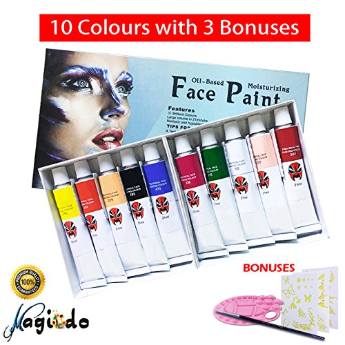 VIVID COLORS - Magicdo face paint kit comes with 12 sticks in different colors -White, Black, Yellow Ochre, Fluorescent Yellow, Emerald Green, Sap Green, Purple, Cyanine Blue, Sky Blue,Russetish, Pink and Orange. This face paint art enables you to dress up your face with brilliant colors and have fun.