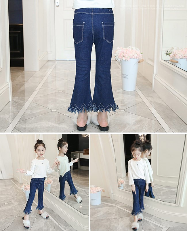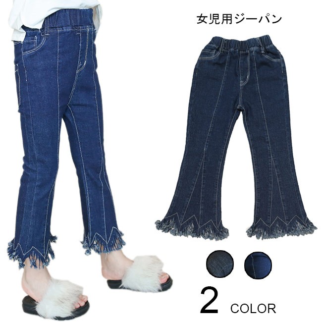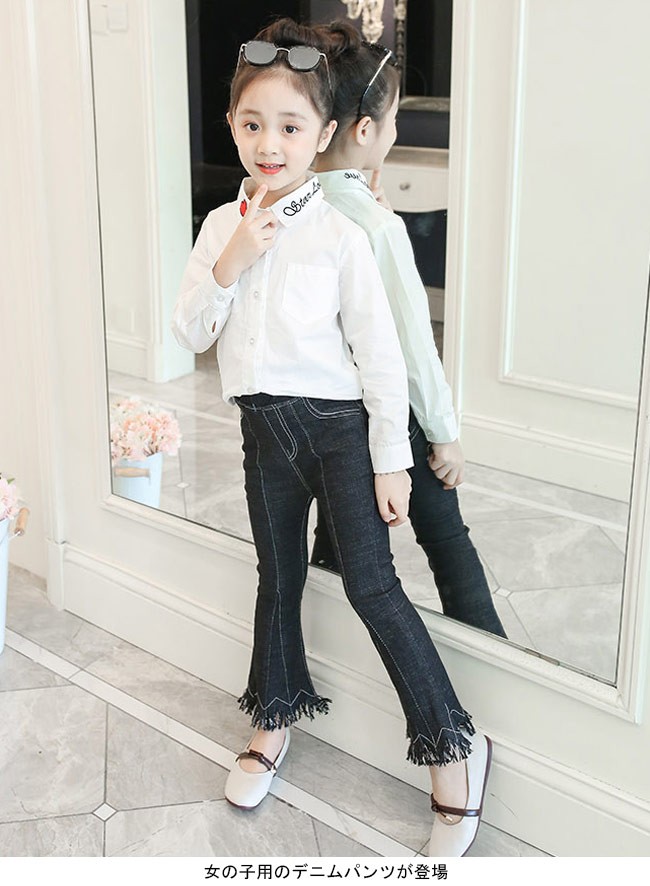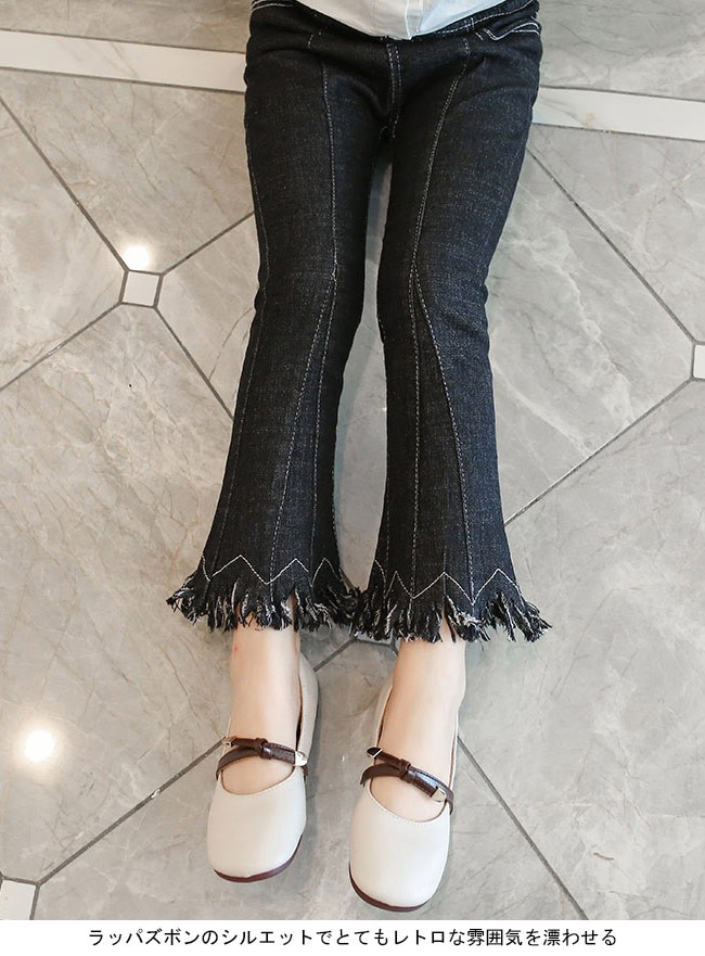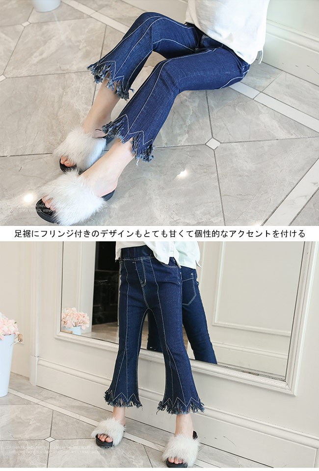 デニムパンツ 女児 ラッパズボン 女の子 ロングパンツ ウエストゴム Gパン 子供用 ボトムス ジーパン ジュニア オールシーズン女の子用のデニムパンツが登場ラッパズボンのシルエットでとてもレトロな雰囲気を漂わせるbr>あえて生地と違う白い糸を使ったステッチもデザインの一部となり、スッキリとしたラインを描き出す足裾にフリンジ付きのデザインもとても甘くて個性的なアクセントを付けるカラー:ブラック ネイビー素材 綿混紡サイズ(cm) 110 120 130 140 150 160110 ヒップ58 ウエスト46 総丈65120 ヒップ60 ウエスト50 総丈70130 ヒップ62 ウエスト52 総丈75140 ヒップ64 ウエスト54 総丈80150 ヒップ66 ウエスト56 総丈85160 ヒップ70 ウエスト58 総丈90ご注意:※サイズは平置きサイズです。素人採寸ですので、若干の誤差がございます、ご了承ください。