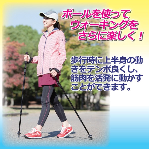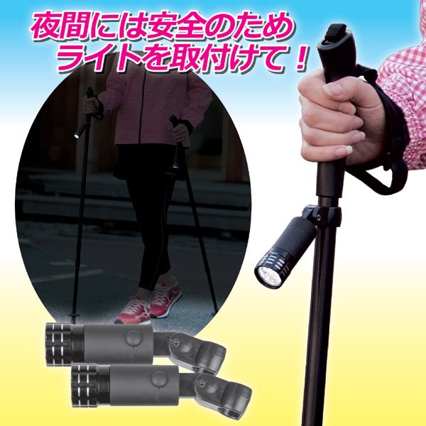 健康維持のために人気のウォーキング運動ですが、上半身の動きがうまくできていない人が多いようです。ウォーキングポールは、歩行時の上半身の動きをテンポ良くし、筋肉を活発に動かすことができる補助具として脚光を浴びています。本製品には、そんなポールにLEDライトを取り付けできるタイプにしてあります。脱着式で角度調節もでき、早朝や夕刻の目印として安全対策にもなります。グリップストラップは長さ調節可能なテーパー形状のものを採用。ポールの長さは無段階で調節でき、男性でも女性でもお使いいただけます。肩に掛けて持ち運びできる専用収納袋付き。