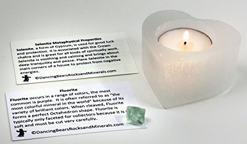 Small Heart Shaped Selenite Candle Holder Gift with free Tealight Candle, Fluorite Octahedron, and Educational Cards. Dancing Bear Brand