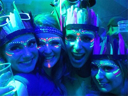 -. Feature : Non-toxic, harmless, non-radioactive, strong environmental adsorption capacity.Non-flammable, non-volatile. No special storage requirements. / Note that you can charge these body paints with ANY LIGHT SOURCE, the stronger the light the brighter and longer lasting the glow. This is a 3 in 1 paint which glows in the dark, is Neon Colour in daytime and will also glow under UV lighting. / Suitable for both day and night use.Provide 6 bright&vivid colors for you. color may vary. Light emission time: after absorption light for 10-20 minutes it can be glow in the dark for 10 hours / Amareu are easily applied, dry quickly on the skin and last all night. Simply wash off with water after use. / Suitable Situation: Perfect for clubbing events, raves, fancy dress, festivals, kids parties, Halloween, school dances, concerts, plays and anywhere with UV light.