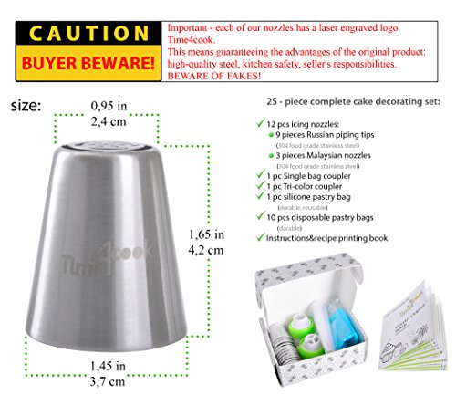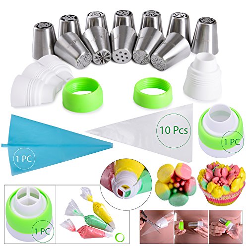 - NEW CAKE DECORATING SET include Russian and Malaysia piping tips in one kit, so you do not need to buy two different sets. Icing Tips large Size, Pastry Bags, Single color and Tri color couplers, Printed colorful instruction book