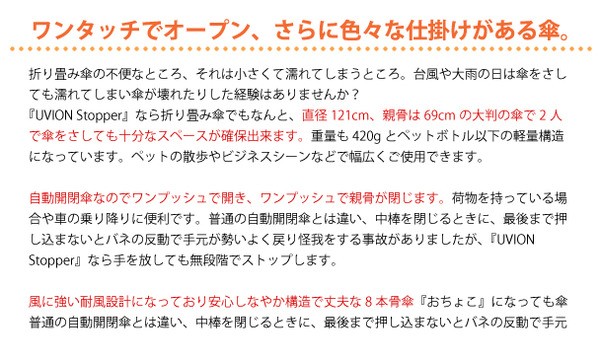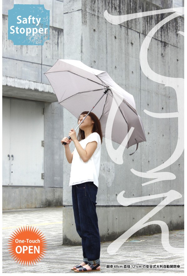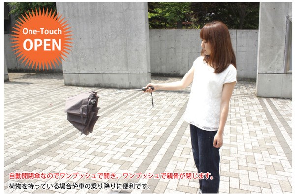 ワンプッシュで開き、ワンプッシュで親骨が閉じます荷物をお持ちの際、車の乗り降りの際に便利です。