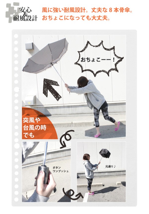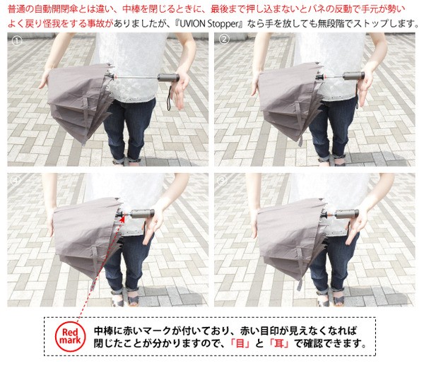 普通の自動開閉傘と違い、中棒を閉じるときに、最後まで押込まないとバネの反動で手元が勢いよく戻り、怪我をする事故がございました。