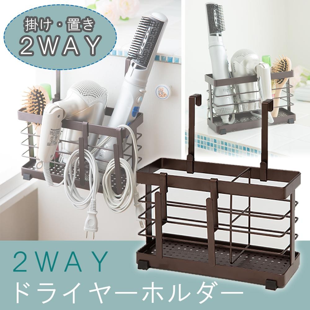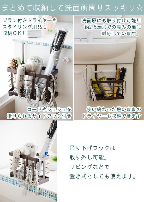 | ドライヤーやヘアーアイロンをまとめて収納☆すぐに取り出せるので使いやすく、洗面所周りがスッキリ片付きます。扉用フックも付いているので、洗面扉にも取り付け可能。コードやシュシュなどを掛けられるサイドフック付き!! |