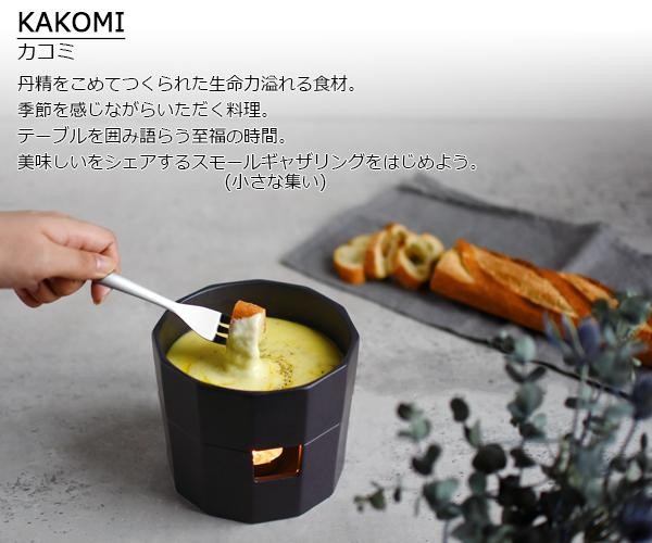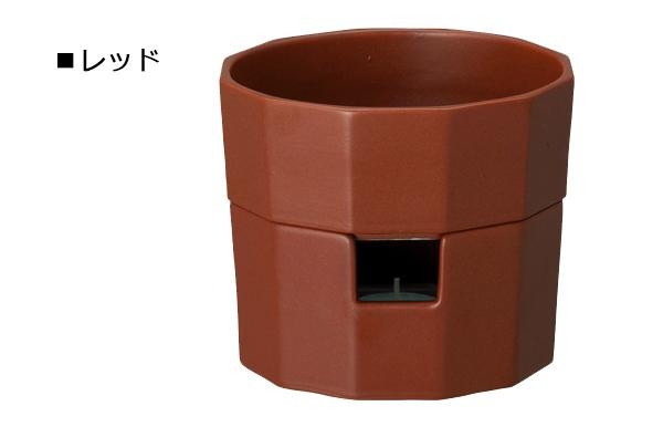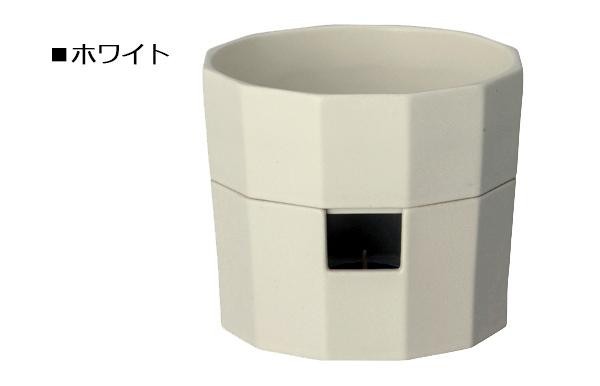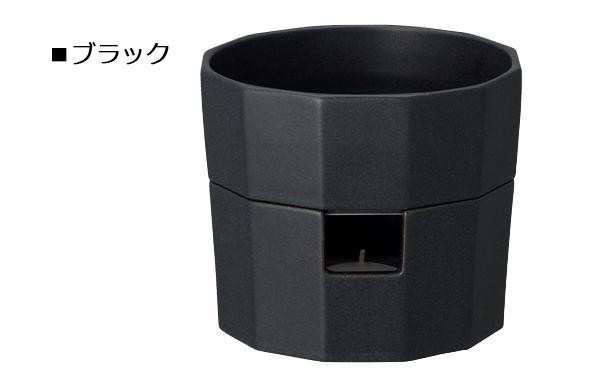 味わいのある釉薬とシャープな形状が特徴的なポットは上下にパーツが分かれる構造で、上の器を電子レンジに入れて調理することができます。下の台の小さな窓は、キャンドルが直接見えないデザインで、柔らかい灯が寒い季節の食卓を暖かく演出します。 |
