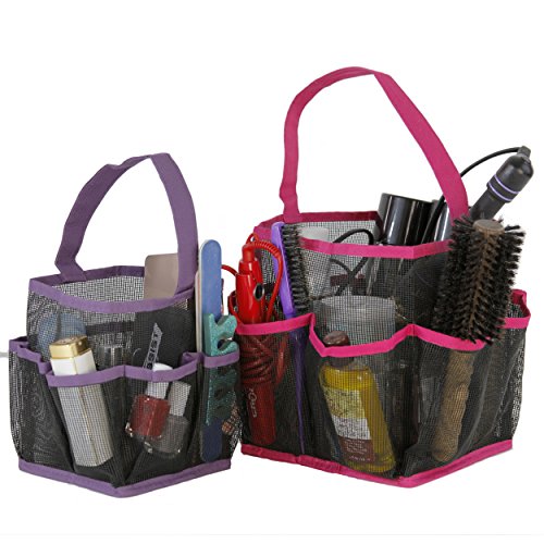 -. Feature : 2 Carry' N Go Mesh Caddies- Bathroom Shower Bags Large Pockets- Keeps Items Visibles / Large Main Pocket With 8 Ample Side Pockets To Hold All Your Bathroom Accessories and Toiletries / Functional- For Gym, School, Dorm, College, Travel, and Bathroom Storage / 2-Sizes- Pink Trim Larger Size and Purple Trim Smaller Size Black Mesh is Quick-Drying without the Smell, Mold or Rust / Mesh Bags Measure: Pink Larger 8" x 8" 10" and Purple Small 6" x 6" x 7" - Toiletries Not Included