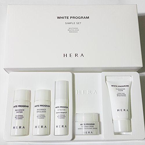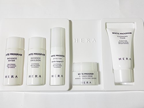 -. Binding : Misc. -. Brand : HERA -. EAN : 8801042789203 -. Feature : White Program Radiance Water 15ml / White Program Radiance lsion 15ml / White Program Biogenic Effecter(Serum) 5ml / White Program Biogenic Cream 5ml / White Program Cleansing Foam 15ml -. IsAdultProduct : 0 -. ProductGroup : Beauty -. ProductTypeName : BEAUTY -. Title : Amore Pacific Hera White Program Simple Set 5 Pcs (Whitening/revitalizing/radiance)