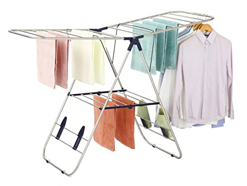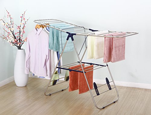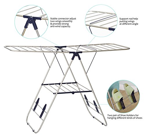 PREMIUM DESIGN DRYING RACK - 2 wings can be adjusted in different positons for either hanging or laying flat your clothes to keep them away from wrinkling; 2 pairs of shoe holders for maximum utilization; Smooth and clean surface without sharp edges protects your hands and delicate clothes