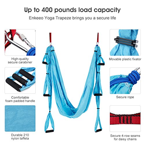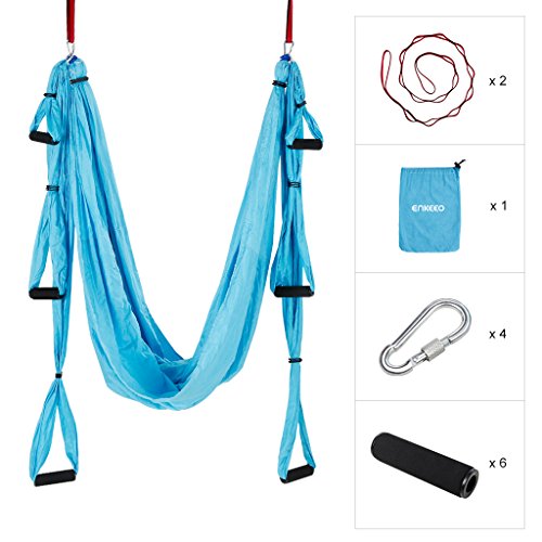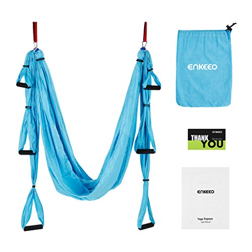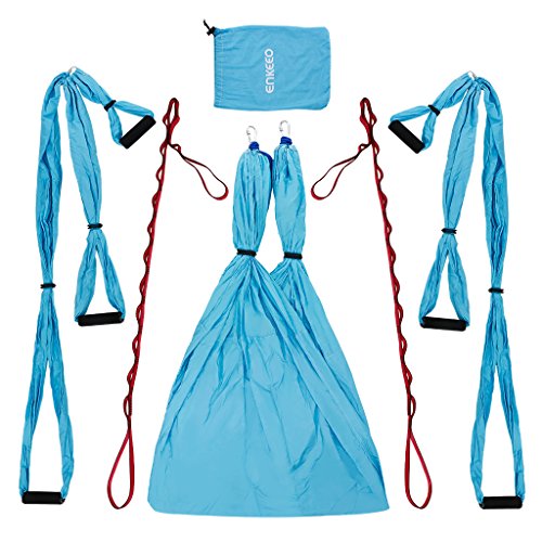 Studio : ENKEEO Publisher : ENKEEO Binding : Misc. Product Description Gym-Grade Quality Material The same model of this Yoga trapeze is used in many Yoga studios and the included Yoga hammock and straps are made of tough and durable Nylon Taffeta material, which makes it a Yoga swing that could be trusted and could hold on to you firmly. The high-density fabric is capable of holding up to 400 pounds. The swing is however light and weighs a mere 4.3 lbs, making it easy to transport. With a size of 2.5 x 2 m / 8.2 x 6.6 ft, the trapeze can be used as hammock or swing as well. Secure and Comfortable Design Besides the durable fabric, the Yoga trapeze set also comes with 2 quadruple stitched daisy chains, and 4 high quality metal carabiners to ensure security during exercise. The foam padded handles prevent fatigue and the large Yoga hammock itself is large enough even for sleeping in it. We confidently believe in the quality of our yoga swing trapeze. Perfect for Yoga/Pilates Practice Whether using it for inversion therapy or core strength building such as using it for backbends, the versatile Yoga trapeze set is sure to be beneficial. It can be your perfect workout tool since it improves the core strength because you have to engage your core muscles to balance and stabilize yourself during practice. Product Specifications Material: 210T Nylon Taffeta Load-bearing Capacity: 400 lbs / 181.4 kg Weight: 4.3 lbs / 1.95 kg Accessories Size - 1 x Yoga Hammock (2.5 x 2 m / 8.2 x 6.6 ft) - 2 x Daisy Chains (2 m x 2 cm x 2 mm / 6.6 ft x 0.8 in x 0.1 in) - 6 x Handles (with Straps, 30/80/140 cm x 2; 1.0/2.6/4.6 in x 2) - 4 x Carabiners (7 x 3.5 x 0.65 cm / 2.8 x 1.4 x 0.3 in) - 1 x Carrying Bag (35 x 29.5 cm / 13.8 x 11.6 in) Package Includes 1 x Yoga Trapeze Set 1 x User Manual 1 x Thank You Card 0