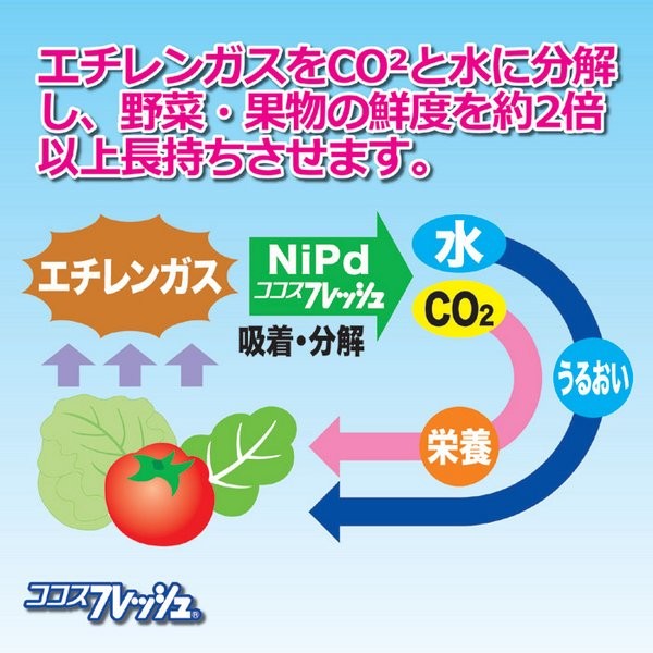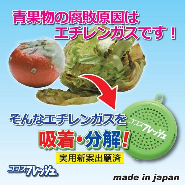 あっ!傷んでる・・・せっかく冷蔵庫に入れておいたのに、知らないうちに傷んでいたという経験はありませんか? 野菜や果物は成熟するためにエチレンガスを出します。このエチレンガスが原因で、傷みを早めたり、微生物などの繁殖を活発にさせたりします。本製品は、その傷みの原因とされるエチレンガスをスピーディーに吸着分解する新発想のキッチングッズです。冷蔵庫の野菜室に一つ入れてください。約1年間もの間、効果を持続し野菜や果物を長持ちさせてくれます。その他、冷蔵庫内(冷凍庫には不向き)や箱等入りで購入したリンゴやみかん類など、常温の状態でもご使用いただけます(空気の流れが多すぎる場所では効果が出にくくなります)。付属の吸盤フックで吊下げても、そのまま置いてもご使用いただけます。内容物は、身体に安全な物を使用した安心設計。