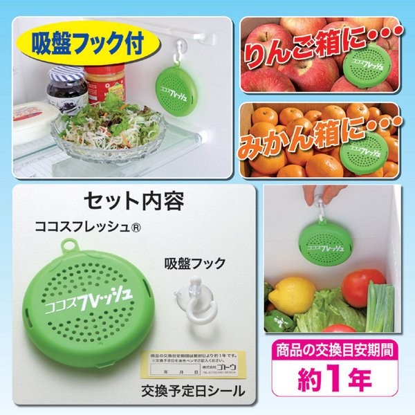 【商品名】鮮度保持剤(ココスフレッシュ) 約1年間有効 吸盤フック/交換予定日シール付き 日本製