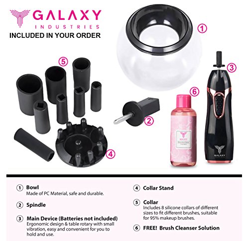 ❤️ PACKAGE INCLUDES 1 Electric Brush Spinner, Eight Rubber Collars, Glass Bowl, Bowl Splash Guard Ring, Manual. FREE BONUS - Includes a 120ml bottle of the Galaxy Industries Makeup Cleaning Solution for an all exclusive bundle!
