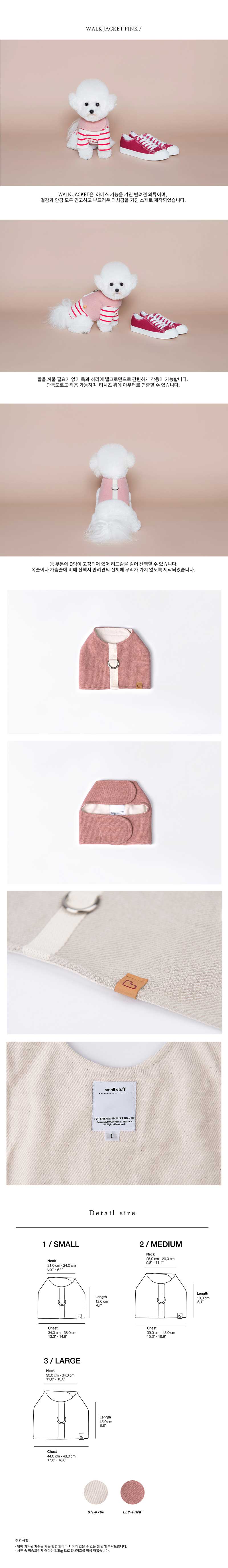 | WALK JACKET은 하네스 기능을 가진 반려견 의류이며, 겉감과 안감 모두 견고하고 부드러운 터치감을 가진 소재로 제작되었습니다. 팔을 끼울 필요가 없이 목과 허리에 벨크로만으로 간편하게 착용이 가능합니다. 단독으로도 착용 가능하며 티셔츠 위에 아우터로 연출할 수 있습니다. 등 부분에 D링이 고정되어 있어 리드줄을 걸어 산책할 수 있습니다. 목줄이나 가슴줄에 비해 산책시 반려견의 신체에 무리가 가지 않도록 제작되었습니다. 사진 속 비숑프리제 애다는 2.3kg으로 S사이즈를 착용하였습니다. |