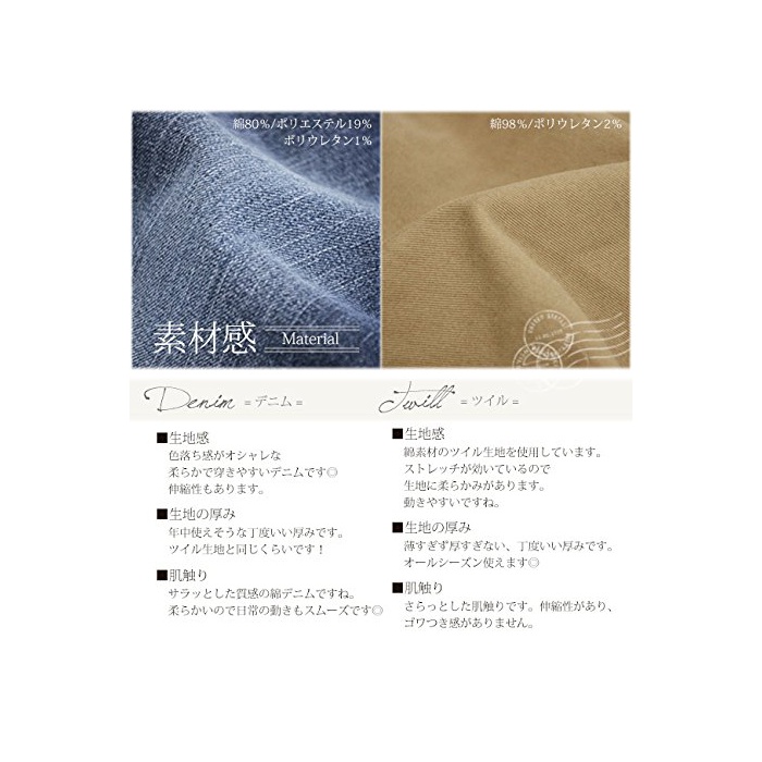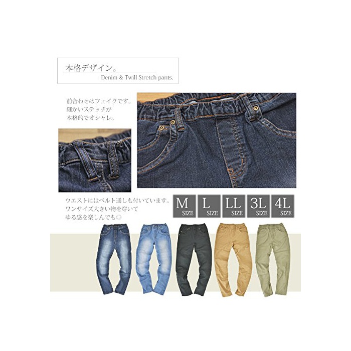 [사이즈] 【M】W:약64-88,H:88,거폭:15,밑위:23.5,밑아래:80,허벅지 폭:26(cm) 【L】W:68-92,H:92,옷자락:16,위:24,하(아래):80,《와》:27(cm) 【LL】W:74-98,H:98,옷자락:7,위:25.5,하(아래):82,《와》:28.5(cm) 【3L】W:80-104,H:104,옷자락:18,위:27.5,하(아래):82,《와》:30(cm) 【4L】W:86-110,H:110,옷자락:19,위:28.5,하(아래):82,《와》:31.5(cm) [소재] (블랙 베이지 카키)면98%/폴리우레탄2% (네이비 블루)면80%/폴리에스텔19%/폴리우레탄1% [메이커 사이즈 표기] 표기 없음 방글라데시제