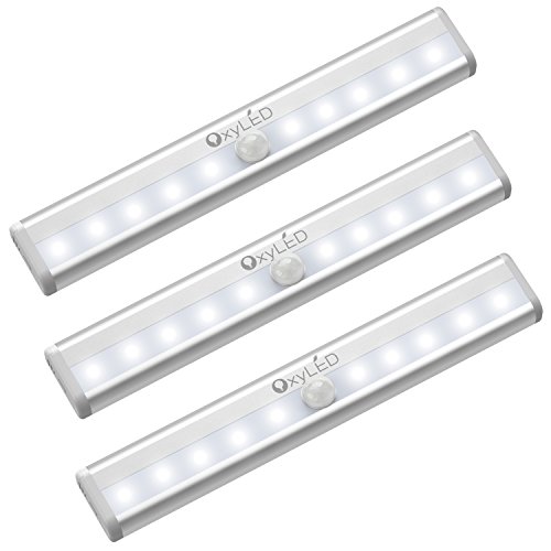 OxyLED Motion Sensor Closet Lights, Cordless Under Cabinet Lightening, Stick-on Anywhere Wireless Battery Operated 10 LED Night Light Bar, Safe Lights for Closet Cabinet Wardrobe Stairs, 3 Pack