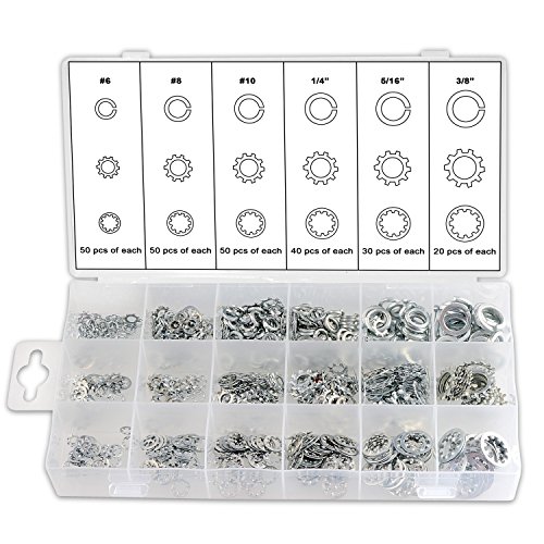 - Internal tooth lock washers 50 pieces each #6 #8 #10 40 pieces 1/4" 30 pieces 5/16" and 20 pieces 3/8"