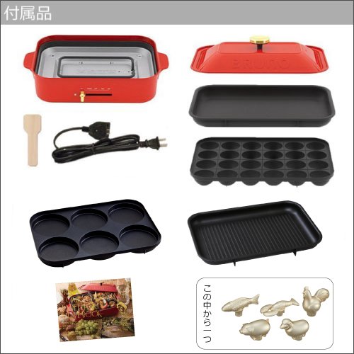 【부속품】뚜껑×1,평평함등 플레이트×1,타코야끼 플레이트×1,멀티 플레이트×1,그릴 플레이트×1,레시피(요리처리법) 북,데코레이션 노브,목제 스파《추라》×1
