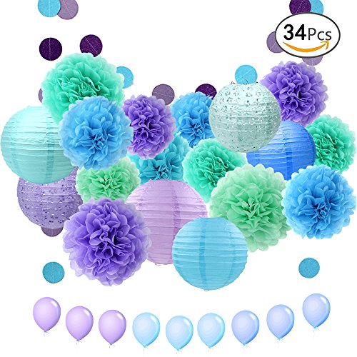 - Product specifications: paper flower pom poms in 3 sizes, 4 colors per size; paper lanterns in 2 sizes, 2 colors per size; hollow paper lanterns in 1 size and 2 colors; 1 blue purple polka dot paper garland; 15 balloons in 3 colors.