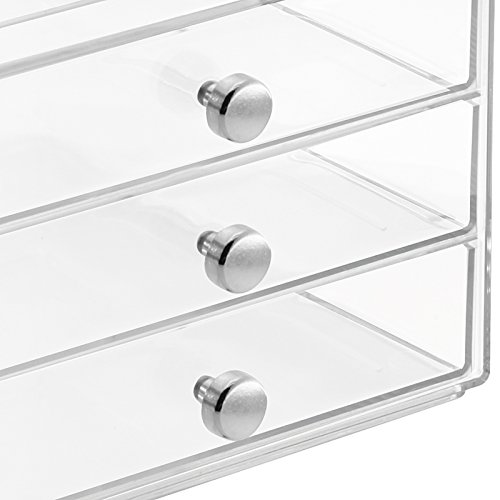 - Feature : Great organization for counter top or vanity / Perfect for makeup, hair accessories and more / Drawers are stackable for customized storage / Durable Clear plastic with Chrome handles / 6.5" x 7" x 5"