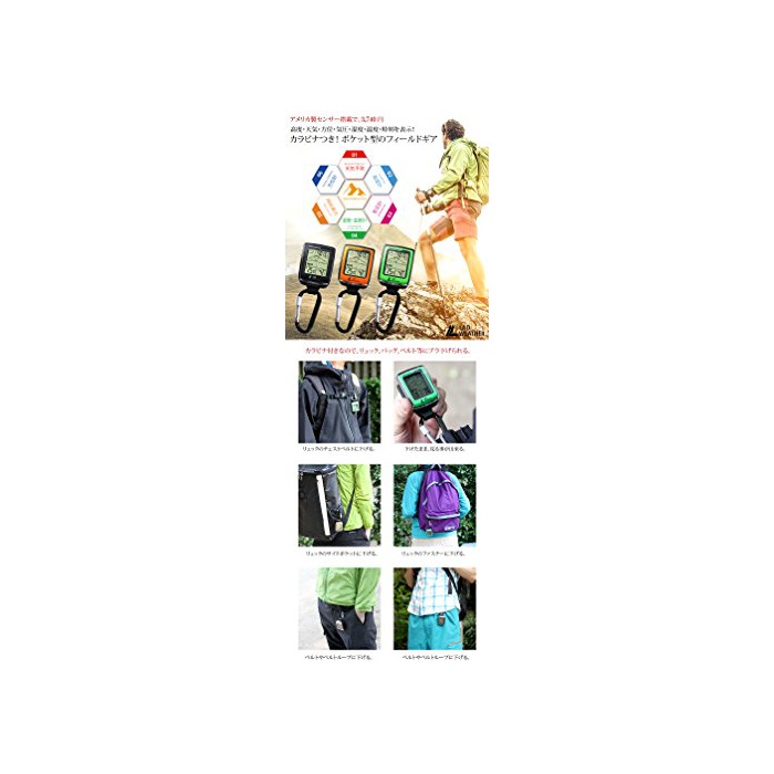 전부 8색 있습니다.이 상품은 03.그린 입니다. 고도계/일기예보/방위계/기압계/습도계/온도계/시계 등 기능으로,카라비너도 붙었다!포켓형의 필드 기어.미국제 센서를 탑재,최강의 아웃도어 상품이 등장.rad weather 센서 마스터4 LAD WEATHER SENSOR MASTER4 카라비너 첨부이므로,배낭,백,벨트등으로 브라 내리는 일이 가능.게다가카라비너를 쓰러뜨려 탁상에 두거나,키 링으로도.아웃도어 만이 아니고, 캠프시의 텐트,직장의 데스크,집이나 리빙에서도 쓸만한다.
