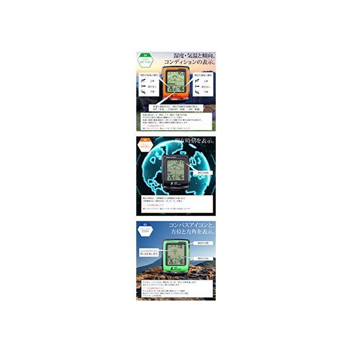 디지탈 kompas.방위와 방향을 안다!kompas 기능을 유효하게 사용 하는 것으로,지지도상에서 미리 결정했어 루트를 정확하게 걷거나,자신의 현재 위치의 확인 등도 나와 옵니다.사전에 결정했어 코스를 제대로 지켜 하이킹 하고 싶은!조금 미아가 되었을 때현재 위치의 확보와 루트의 확인에 대활약! 현재 시각을 표시.12시간표시/24시간표시를 선택 가능.여행 캠프 텐트 등산 하이킹 낚시 리빙 등으로 대활약!