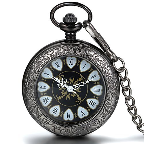 -. Title : JewelryWe Mechanical Pocket Watch Roman Number Half Hunter Antiqued Black Case Fob Watch with Chain Belt