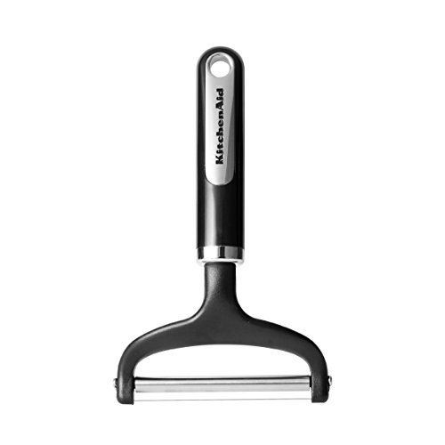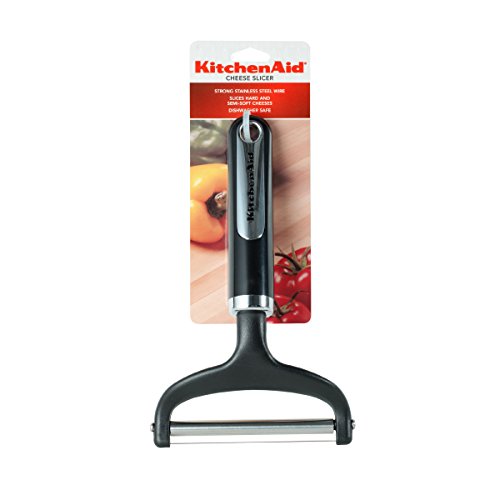 Serve up an assortment of fine cheeses at your next party with this KitchenAid Classic Cheese Slicer. This peeler's grip is constructed of tough, lightweight plastic. The peeler's cutting wire is constructed from tough, rust-resistant stainless steel. The slicer cuts both hard and soft cheeses quickly and cleanly. A loop at the end of the handle allows it to be hung for easy storage. This product is not dishwasher safe. Hand wash with warm water and a mild detergent; rinse and dry immediately.