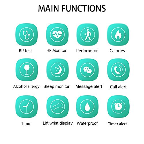 -. Feature : *Main Functions: Heart Rate Monitor, Blood Pressure Monitor, Steps Counter, Calories burned Tracking, Incoming Calls Reminder, Life-Waterproof, Sleep Quaity Monitor, Time Display, Message notification, Smart Alarm Clock, Alcohol allergy Monitor, Lift the wrist bright screen etc.. / *Intelligent monitoring and remindering the heart rate: According to height, weight, age, sex and other information of the wearer to calculate the healthy heart rate section, 24-hour real-time monitoring; analysis of heart rate changes, it will be promptly reminded when find abnormalities. / *Monitoring sleep: Sleep algorithm combined with the data of heart rate will be more accurate, it can provide more accurate reference for user's health and rest. / *Multifunction: Monitoring exercise and provide fitness advice, monitoring allergic drinking.Calling and SMS alerts.Alarm function(reminder with no noise to avoid the bad sticmlation of the heart when sudden sound, do not wake up the families). / *Competible with IOS Android 4.4 and above or iOS 8.0 and above, Such as: for IPhone5/5s/6/6s plus/7/7plus, for Samsung Galaxy Note3/4/5, for Sony, HTC, Huawei, Xiaomi smart Phones etc..