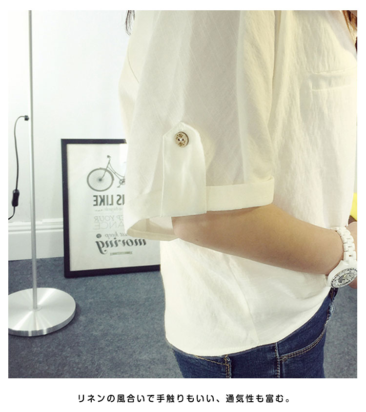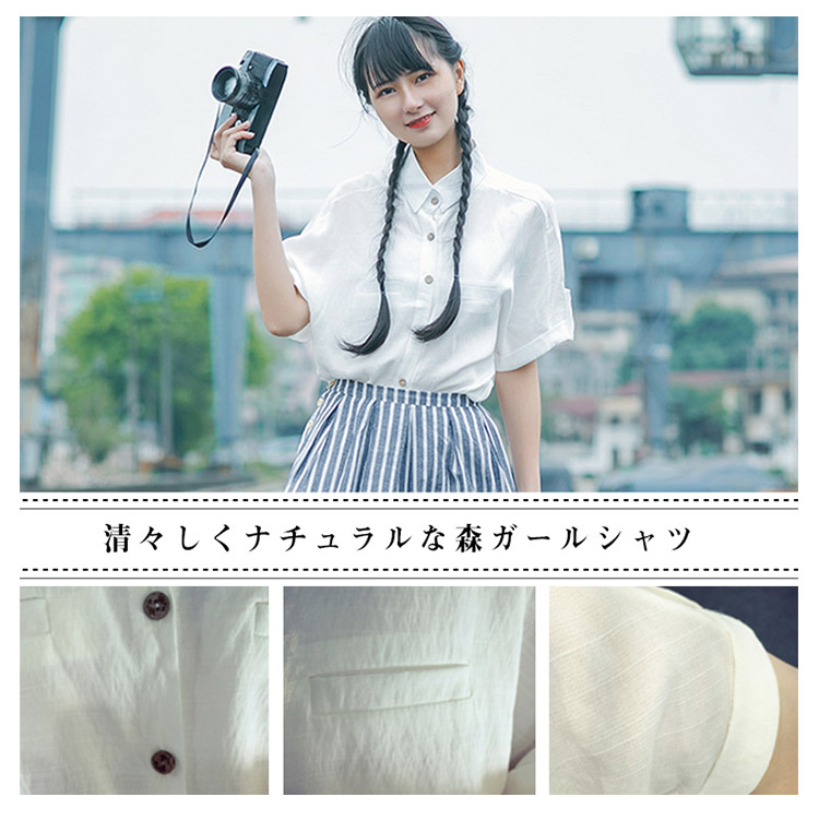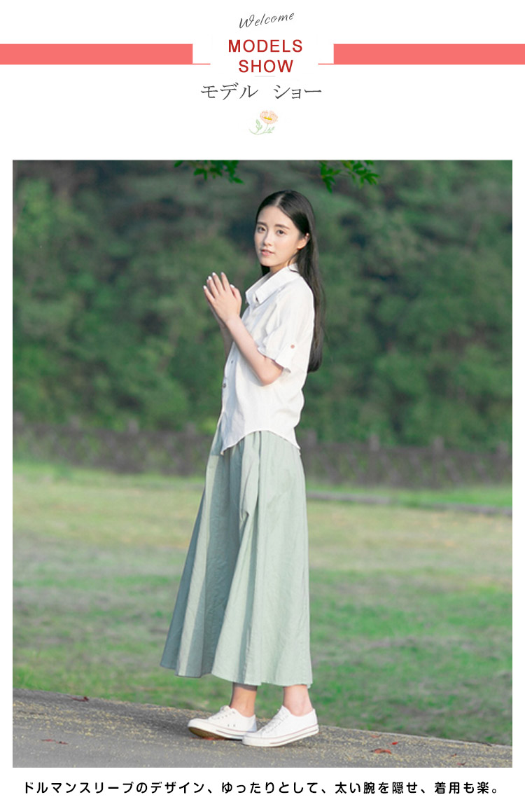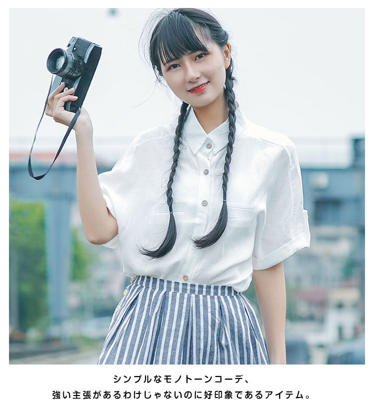 | 清々しくナチュラルな森ガールシャツ。POLO襟で、さらに小顔に、立体感もアップ。ドルマンスリーブのデザイン、ゆったりとして、太い腕を隠せ、着用も楽。シンプルなモノトーンコーデ、強い主張があるわけじゃないのに好印象であるアイテム。 | |